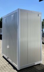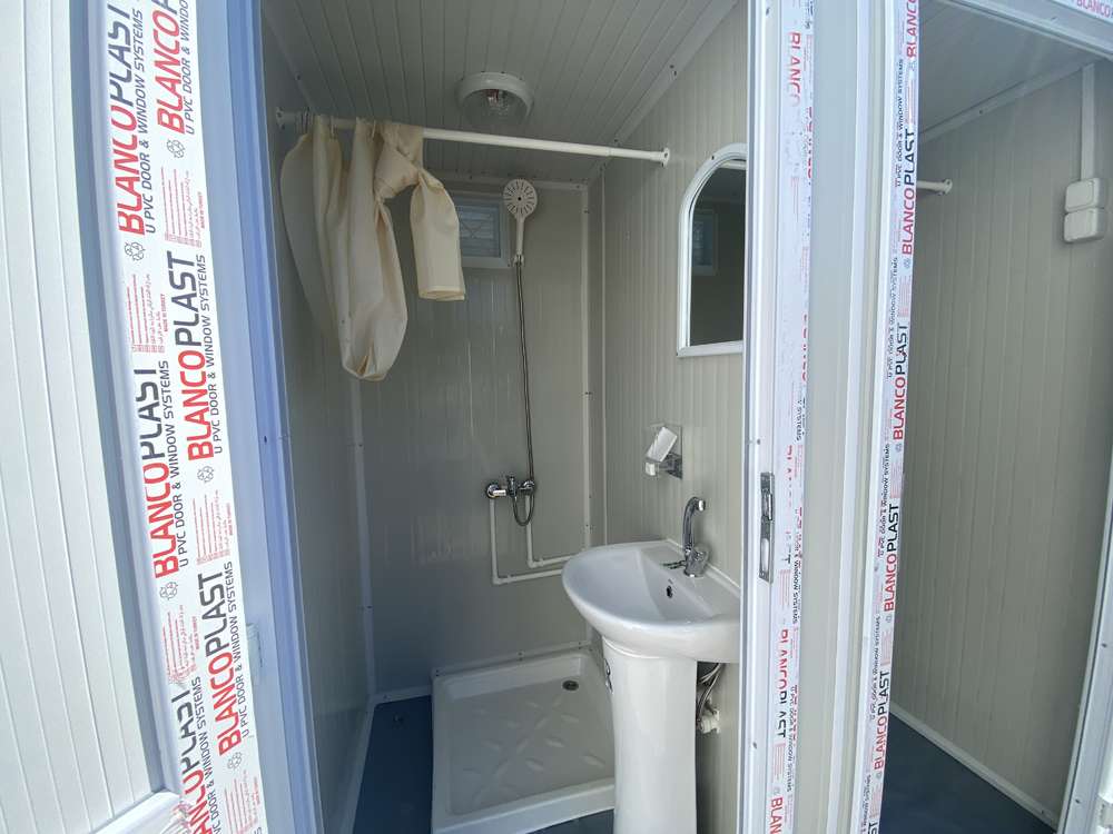 Deux portes donnant sur deux cabines de douche indépendantes, chacune équipée d’un lavabo et d’un lave-mains