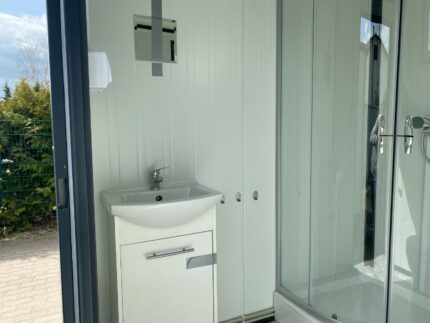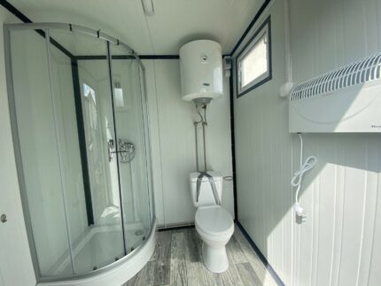 Notre bloc sanitaire complet de 2 x 2 mètres comprend un module équipé de toilettes, d’un lavabo avec meuble sous vasque et d’une cabine de douche. Il est également doté d’une fenêtre d’aération et d’un système de chauffage. Prêt à l’emploi, facile à installer et à entretenir, ce bloc sanitaire répond aux exigences les plus élevées en matière d’hygiène et de praticité.