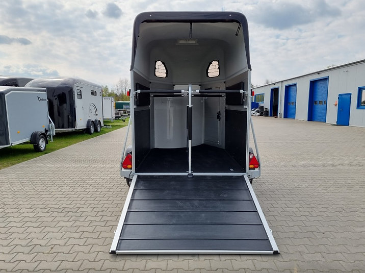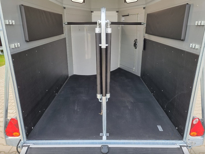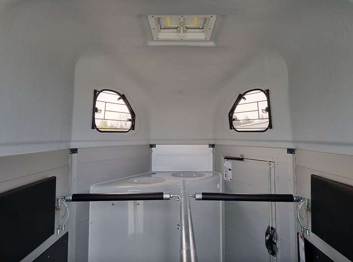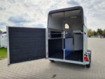 Le HBX 506, 2 places est idéal pour transporter deux chevaux. Il est équipé de série de deux vitres latérales, d’une grande fenêtre avant, de longerons latéraux, d’un portail et de barres de recul. Pour les propriétaires de fourgons recherchant une polyvalence accrue, le pont de portail standard est idéal. Fonctionnant comme un pont pour le chargement des chevaux, il peut également s’ouvrir comme une porte latérale, permettant ainsi à un chariot élévateur de chargeur d’objets lourds dans le fourgon.